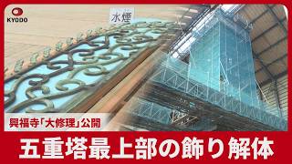The dismantling of the higher decoration of the five-story pagoda at Kofukuji, a UNESCO World Heritage web site in Nara, was opened to the media on April 15 because the temple undergoes its first main restoration in round 120 years.