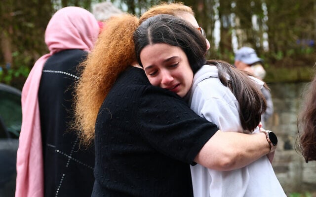Members of the neighborhood consolation one another close to Heaton Park Hebrew Congregation Synagogue in Crumpsall, north Manchester, on October 2, 2025, following a lethal terrorist assault on the synagogue. (Paul Currie / AFP)